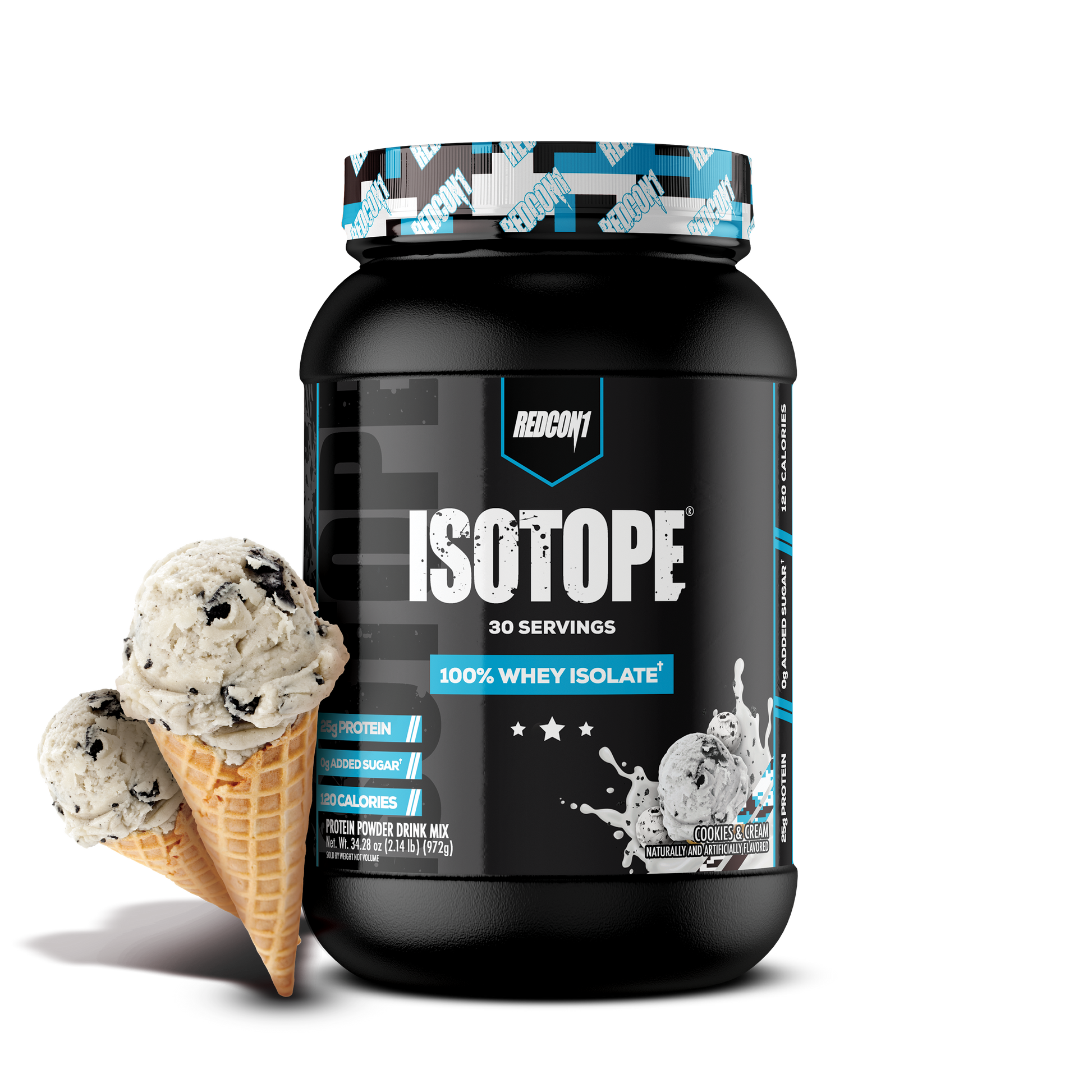 Fuel your body with fast absorbing 100% whey protein isolate to aid in muscle recovery and promote muscle growth. Formulated with 25g protein, 0 added sugar, and only 120 calories per scoop, Redcon1's Isotope provides the ultimate absorption and recovery support you need to meet your protein and muscle building goals.